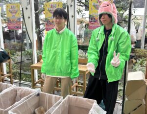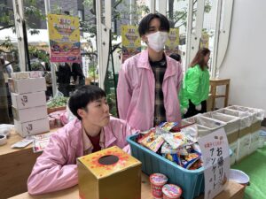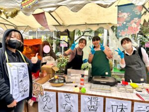 味噌班は、「焼き餅」模擬店を開店!あんこ、醤油、味噌、きなこの4種類の味が並び、お客様が絶え間なく訪れる大繁盛ぶりでした。焦げ目のついた焼き餅は、雨模様の肌寒い日にぴったりの温かい一品。学生たちもテキパキと対応し、大忙しの一日でした。