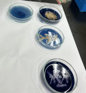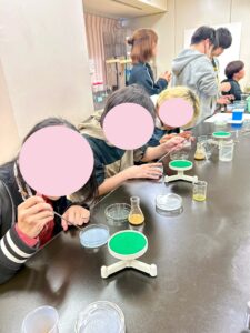 キノコ班は、微生物の白金耳を使った植菌体験!(実際は、微生物は使わず胃薬を使ってお絵描き)実習で行う「植菌」の気分を味わってもらいました。