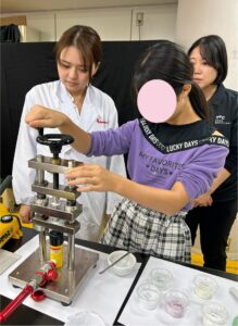 アクアポニックス班は、手動卓上錠剤形成機を使った、ラムネ作り体験コーナー。技術を応用したユニークな体験が大人気でした。