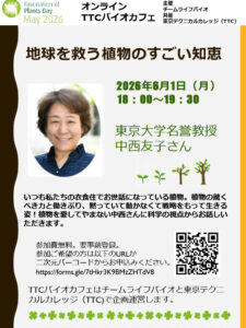 毎年5月は「国際植物の日」(※1)のグローバルイベントとして、植物をテーマにしたTTCバイオカフェを開催しており、今回のテーマは『地球を救う植物のすごい知恵』です。