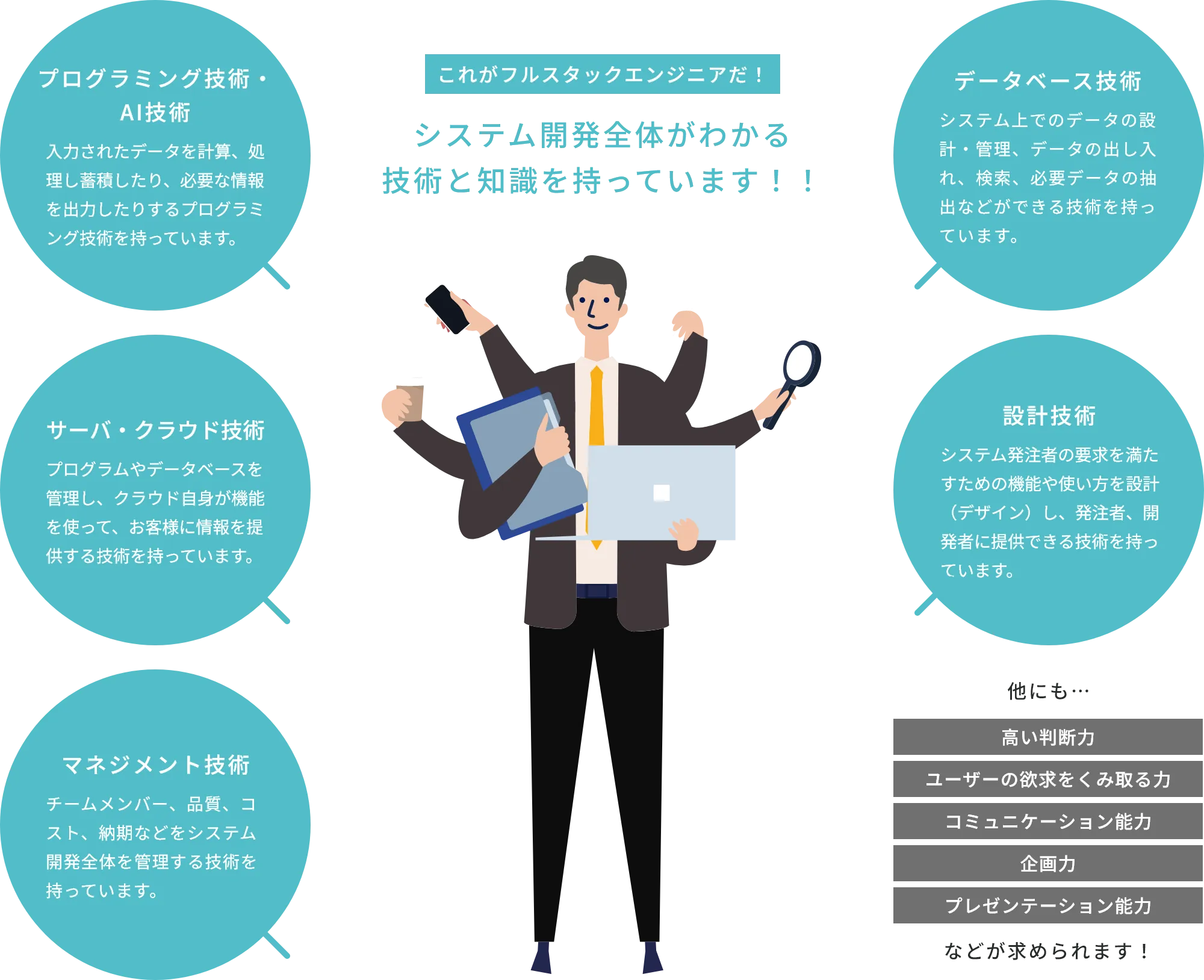 コンピュータシステム開発において、「設計」、「実装(プログラム等)」、「データベース」、「クラウド」、「運用」の全ての工程を手掛けることができるエンジニアです。クラウド中心の時代において、今業界で求められている人材です。