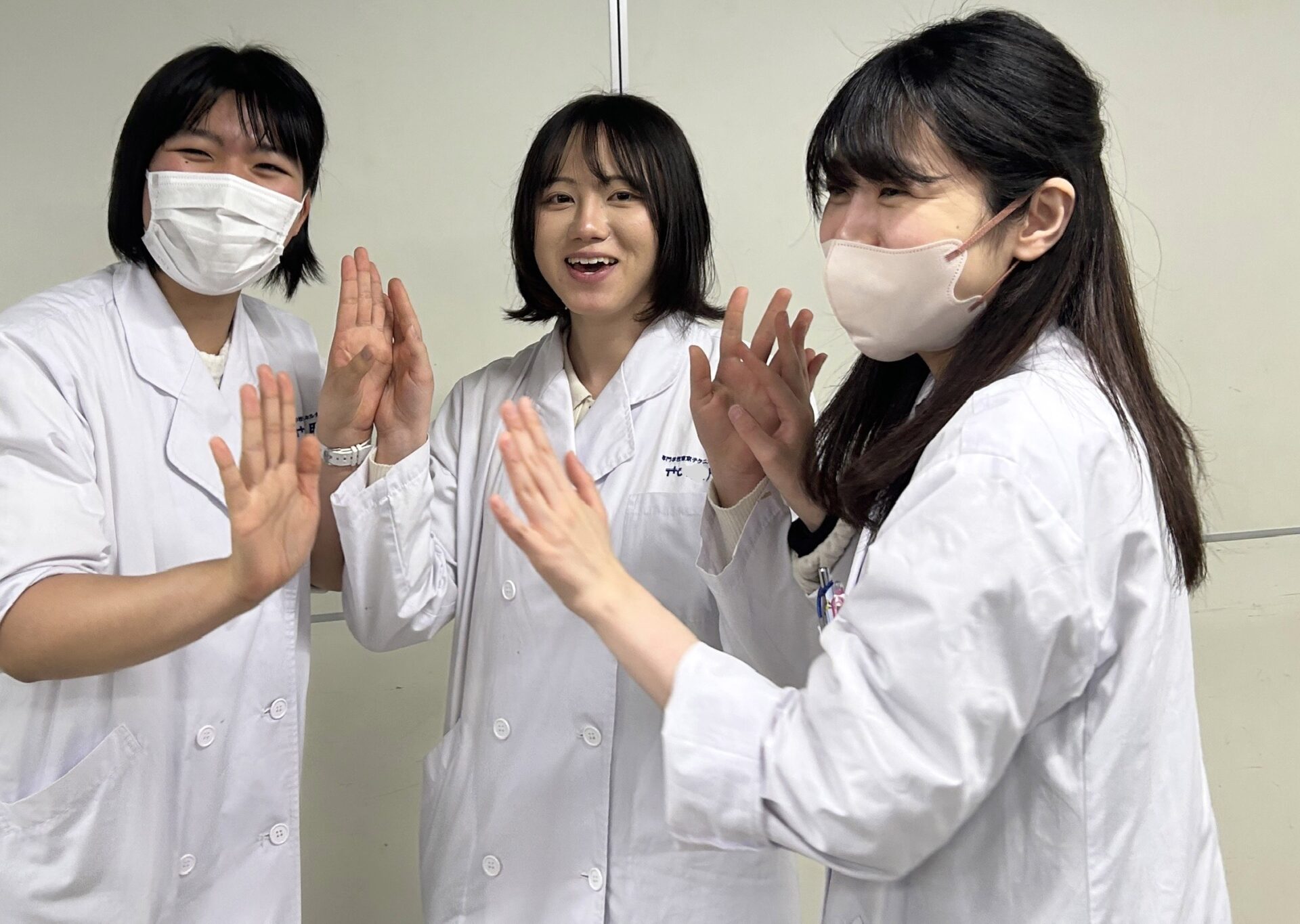 手をとり合って実験の成功を喜ぶ、バイオテクノロジー科の学生