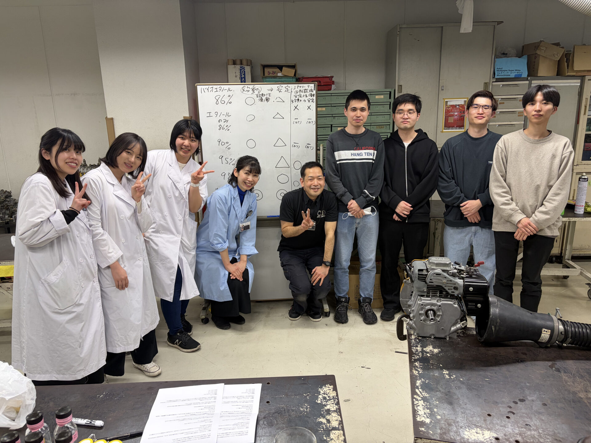 今回のプロジェクトは、学生たちの「やりたい!」という純粋な好奇心から始まりました。酒税法や教育目的の製造申請といった法的な確認からスタートし、目標のアルコール濃度95%には届かなかったものの、ガソリンと混合したE30として実用レベルであることを自ら証明しました。「教えてもらう授業」から、自ら課題を解決する「自発的な学び」へ。試行錯誤を繰り返し、壁を乗り越えていく姿に確かな成長を感じました。達成感と自信に満ちた彼らのこれからが、本当に楽しみです。